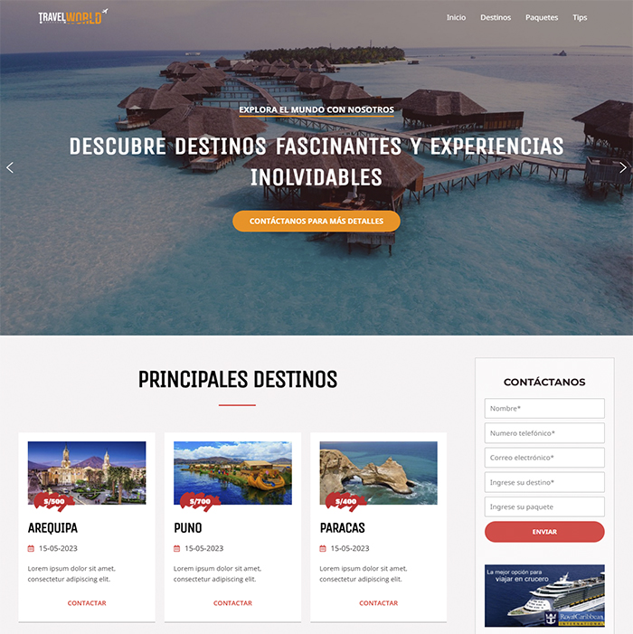 Descubre el mundo con nuestra plantilla web para agencias de viaje. Ofrece destinos emocionantes, itinerarios personalizados y una experiencia de reserva sencilla. ¡Viajar nunca ha sido tan fácil!